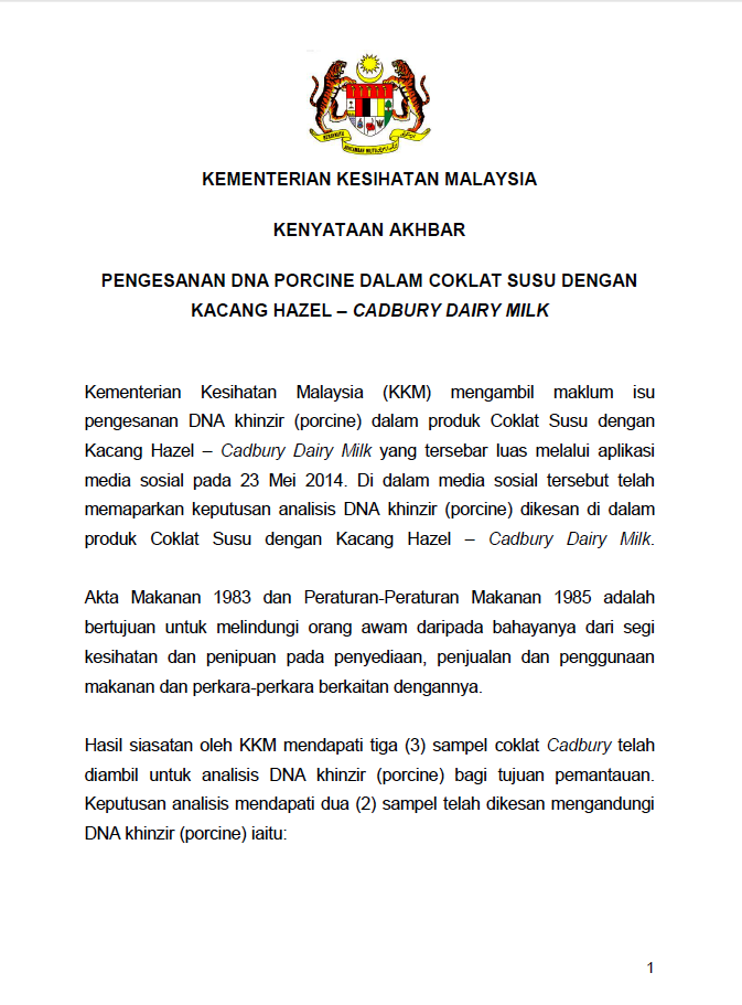 "Di dalam media sosial itu telah memaparkan keputusan analisis DNA khinzir (babi)(porcine) dikesan di dalam produk Coklat Susu dengan Kacang Hazel – Cadbury Dairy Milk.